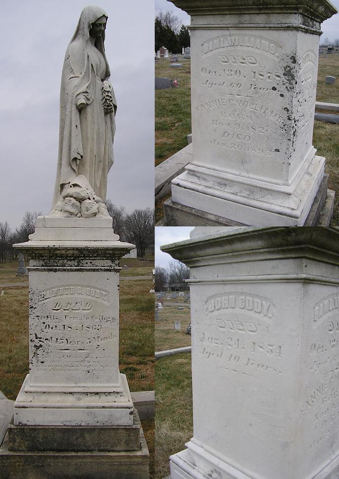 Fannie C. Cody b.~May 1854, d.18 Oct 1869 and John Cody b.~1814, d.24 Aug 1854 and Samuel Williams b.~1818, d.30 Oct 1878 and Fannie C. Williams b.9 Nov 1821, d.20 Jan 1893 |